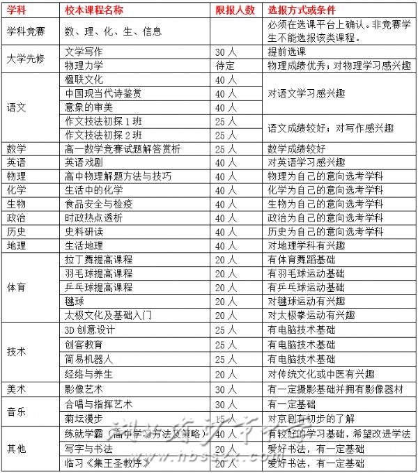 2020級學生校本課程目錄及學生選報要求 此次評審結束后,學校將組織2020級學生進行平臺選課,目前共有近40門校本課程供學生選擇,這將極大地補充學科知識學習,拓寬學生知識視野,滿足學生個性發展需要,促進學生全面發展。