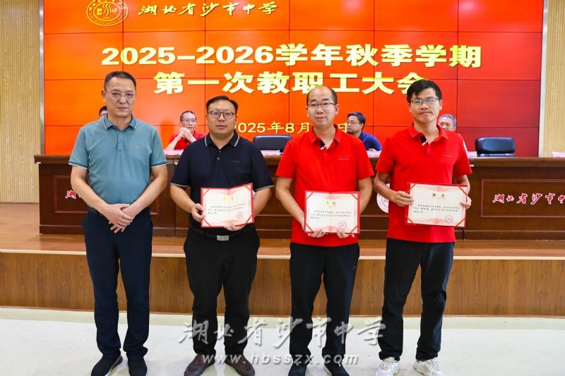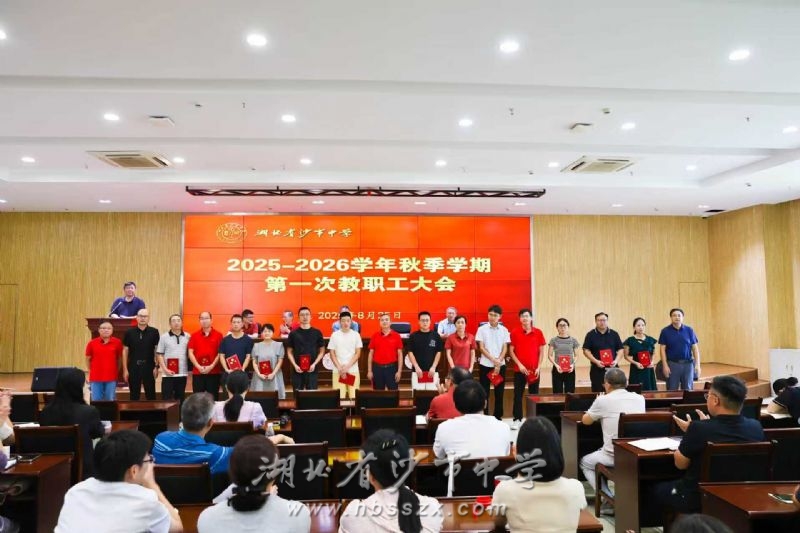 徐善慧為新聘任的高一年級各班班主任頒發聘書 2025年8月25日上午9時,沙市中學全體教職工齊聚學校綜合樓二樓會議室,召開2025-2026學年度上學期第一次教職工大會。