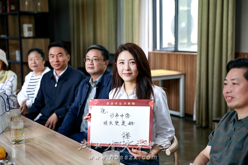 在習坎樓會客室,曾黎在留言簿上寫下:“祝沙市中學明天更美好”,表達對母校的深厚情誼和美好祝愿。