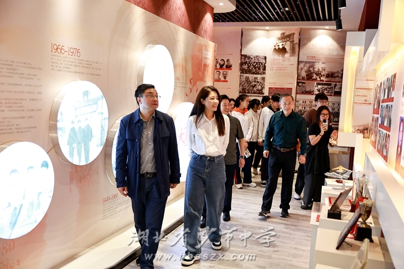 在裴毅、盧永楨、徐善慧等人的陪同下,曾黎一行從東門進入校園,沿途經東門廣場、院士墻、教學樓、運動場等地,詳細了解了校園新貌,并參觀了學校“五育并舉”教育成果展及學生社團活動展示。曾黎表示,這是她第一次來到母校新校區,深感校園環境優美如花園,綠化景觀宜人。她特別贊賞學校在高考、學科競賽、科技制作和體育藝術等方面取得的優異成績,并對學生活動豐富多樣、甚至設有勞動實踐基地表示驚喜。她認為,沙市中學為學生提供了多元成長路徑和全面發展的平臺。徐善慧校長向曾黎介紹了學校的辦學特色、近年成就以及未來發展規劃。