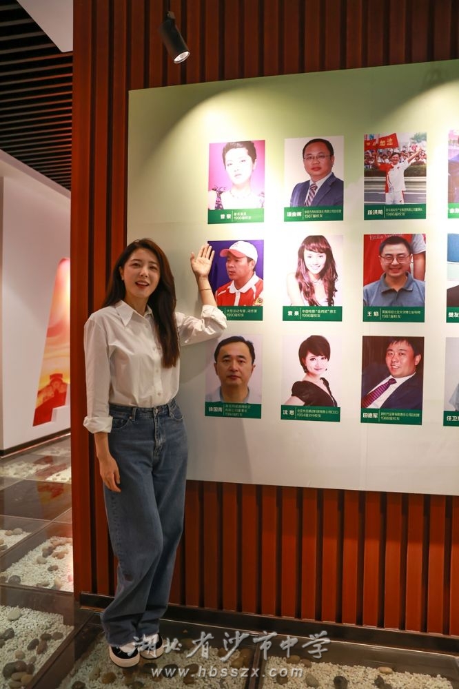 在校史館,曾黎在自己作為杰出校友的介紹展板前合影留念。