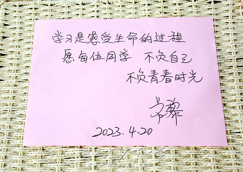 2023年4月20日首屆楚文化節期間,曾黎曾委托母親沈克珍女士來到沙市中學參觀交流,并向母校捐贈個人自傳《順風而生》。當時,她為學弟學妹親筆題寫寄語:“學習是感受生命的過程,愿每位同學不負自己,不負青春時光。”